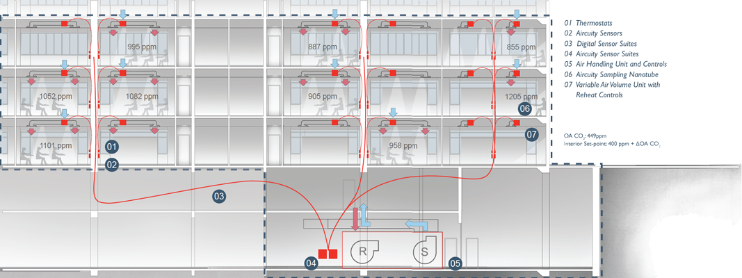 Unique to this project is a VAV system capable modulating the air flow to work in conjunction with classroom C02 and ventilation requirements. The installation of the Aircuity system provides improved ventilation during peak hours of occupancy. Buildings without demand controlled ventilation are usually over ventilating classrooms during periods of low occupancy which results in increased cost. The Aircuity system has the ability to process space CO2 levels and modulate the airflow depending on the number of rooms in alarm.